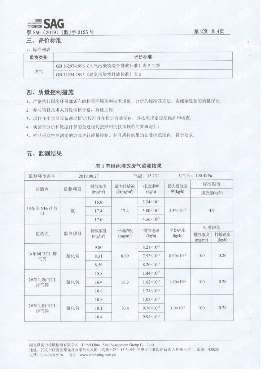 2019年第三季度,公司按照国家企业安全生产标准,对公司所排出的废气,委托第三方进行抽样检测,详细的检测报告如下