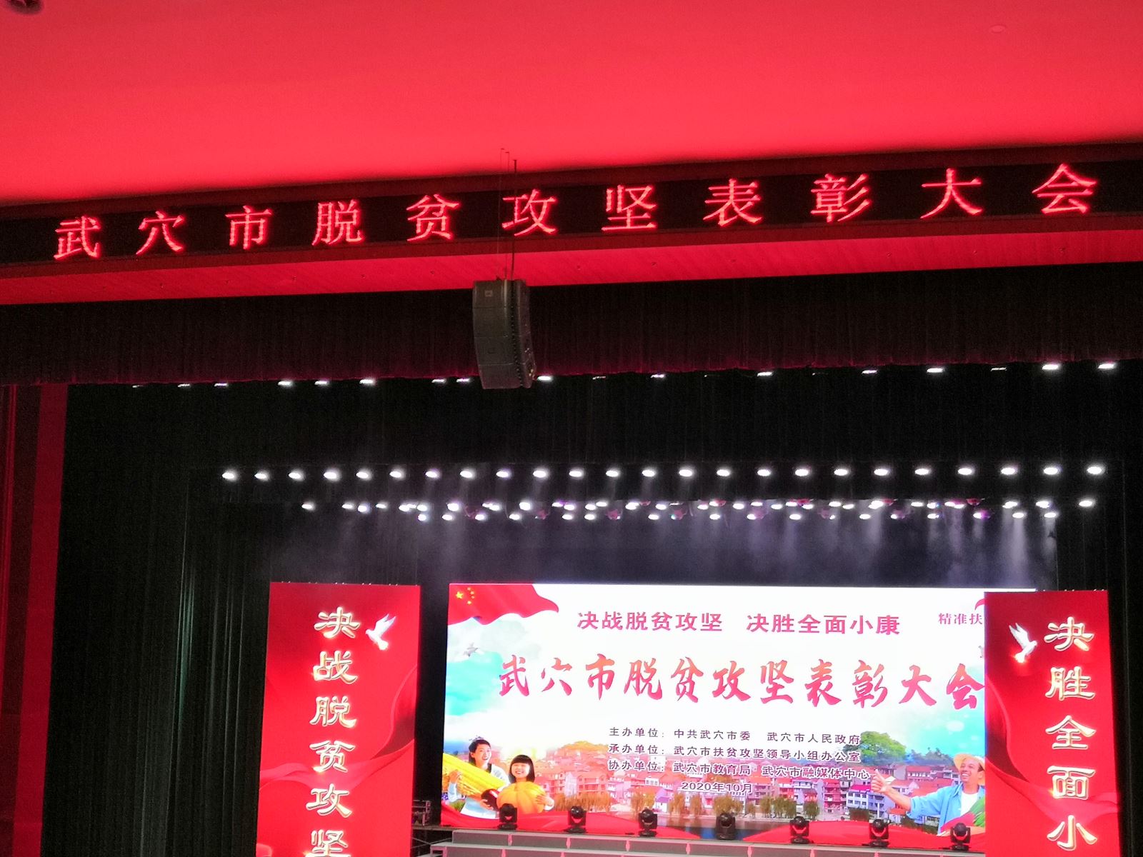 2020年10月16日上午8时,湖北省武穴市在城东大剧院隆重召开脱贫攻坚表彰大会。此次表彰大会以中共武穴市委、武穴市人民政府主办,武穴市教育局、武穴市融媒体中心协办,武穴市扶贫攻坚领导小组办公室承办。