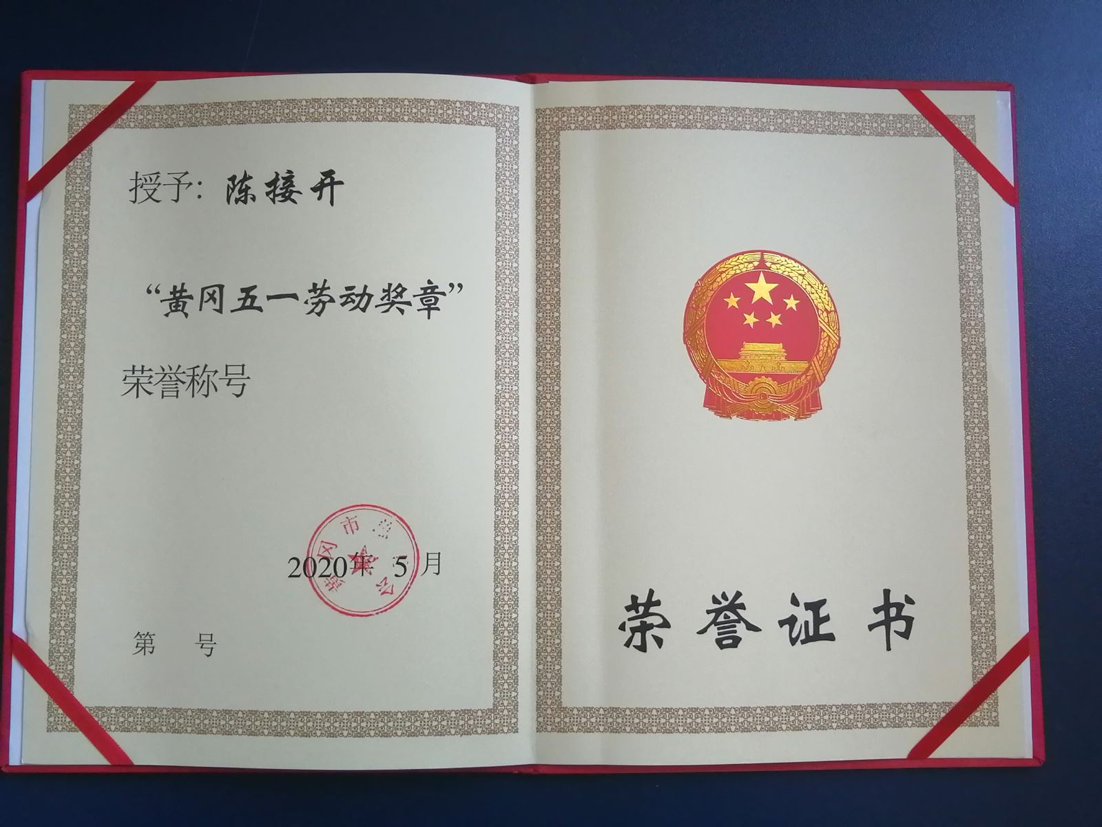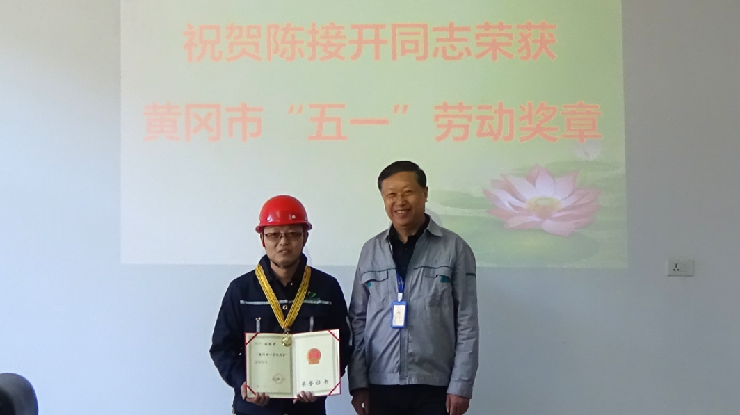 2020年11月11日上午9时许,湖北省武穴市总工会在公司会议室授予陈接开同志荣获黄冈市“五一”劳动奖章,此奖章由黄冈总工会颁发,武穴总工会转授。