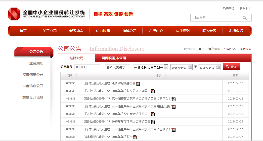 2016年4月8日,全国中小企业股份转让系统发布公告《美天生物股票解除限售公告》。环球平台_环球(中国)一站式服务平台证券代码为833833,证券简称美天生物,主办券商为申万宏源。本批次股票解除限购数量总额为29682395股,占公司总股份的比例为58.29%,可转让时间为2016年4月15日。具体信息详见公司在股转系统发布2016-007号公告。